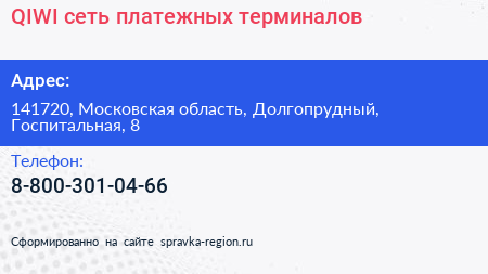 QIWI, сеть платежных терминалов по адресу 141720, Московская область, Долгопрудный, Госпитальная, 8 в дальнейшем Организация, размещена в следующих категориях: