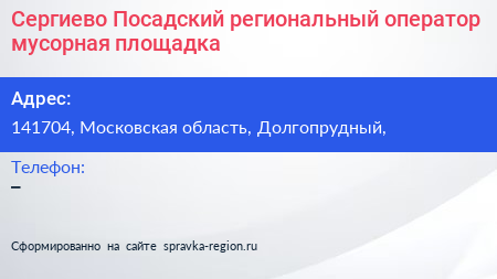 Сергиево-Посадский региональный оператор, мусорная площадка по адресу 141704, Московская область, Долгопрудный, в дальнейшем Организация, размещена в следующих категориях: