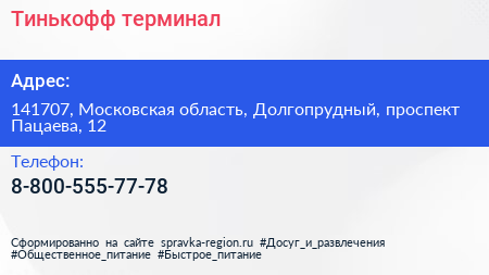 Тинькофф, терминал по адресу 141707, Московская область, Долгопрудный, проспект Пацаева, 12 в дальнейшем Организация, размещена в следующих категориях: