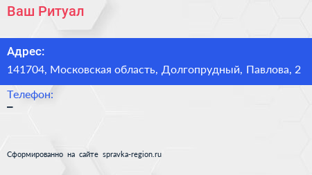 Ваш Ритуал по адресу 141704, Московская область, Долгопрудный, Павлова, 2 в дальнейшем Организация, размещена в следующих категориях: