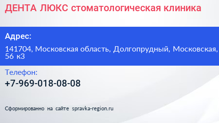 ДЕНТА-ЛЮКС, стоматологическая клиника по адресу 141704, Московская область, Долгопрудный, Московская, 56 к3 в дальнейшем Организация, размещена в следующих категориях: