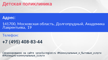 Детская поликлиника по адресу 141700, Московская область, Долгопрудный, Академика Лаврентьева, 19 в дальнейшем Организация, размещена в следующих категориях: