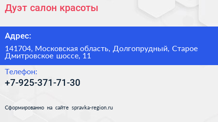 Дуэт, салон красоты по адресу 141704, Московская область, Долгопрудный, Старое Дмитровское шоссе, 11 в дальнейшем Организация, размещена в следующих категориях:
