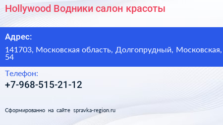 Hollywood Водники, салон красоты по адресу 141703, Московская область, Долгопрудный, Московская, 54 в дальнейшем Организация, размещена в следующих категориях: