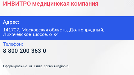 ИНВИТРО, медицинская компания по адресу 141707, Московская область, Долгопрудный, Лихачёвское шоссе, 6 к4 в дальнейшем Организация, размещена в следующих категориях:
