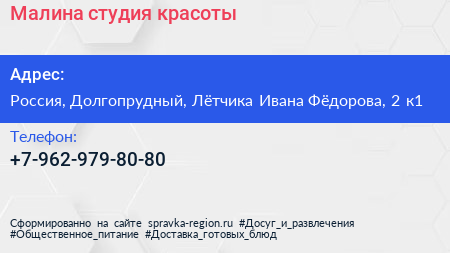 Малина, студия красоты по адресу 2 к1, улица Лётчика Ивана Фёдорова, Жилой комплекс «Город набережных», Химки, городской округ Химки, Московская область, Центральный федеральный округ, 141402, Россия в дальнейшем Организация, размещена в следующих категориях: