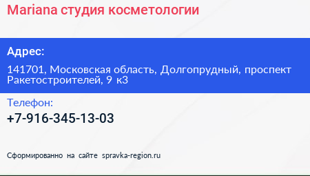 Mariana, студия косметологии по адресу 141701, Московская область, Долгопрудный, проспект Ракетостроителей, 9 к3 в дальнейшем Организация, размещена в следующих категориях: