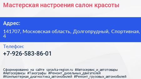 Мастерская настроения, салон красоты по адресу 141707, Московская область, Долгопрудный, Спортивная, 4 в дальнейшем Организация, размещена в следующих категориях: