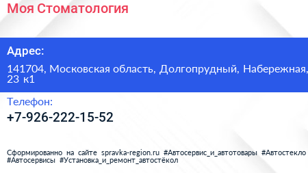 Моя Стоматология по адресу 141704, Московская область, Долгопрудный, Набережная, 23 к1 в дальнейшем Организация, размещена в следующих категориях: