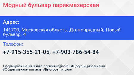 Модный бульвар, парикмахерская по адресу 141700, Московская область, Долгопрудный, Новый бульвар, 4 в дальнейшем Организация, размещена в следующих категориях: