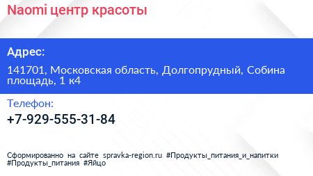 Naomi, центр красоты по адресу 141701, Московская область, Долгопрудный, Собина площадь, 1 к4 в дальнейшем Организация, размещена в следующих категориях: