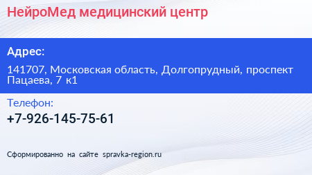 НейроМед, медицинский центр по адресу 141707, Московская область, Долгопрудный, проспект Пацаева, 7 к1 в дальнейшем Организация, размещена в следующих категориях: