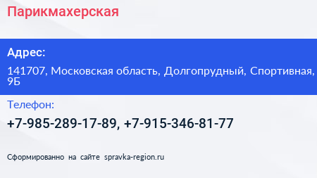Парикмахерская по адресу 141707, Московская область, Долгопрудный, Спортивная, 9Б в дальнейшем Организация, размещена в следующих категориях: