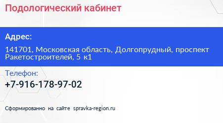 Подологический кабинет по адресу 141701, Московская область, Долгопрудный, проспект Ракетостроителей, 5 к1 в дальнейшем Организация, размещена в следующих категориях: