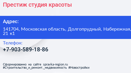 Престиж, студия красоты по адресу 141704, Московская область, Долгопрудный, Набережная, 21 к1 в дальнейшем Организация, размещена в следующих категориях: