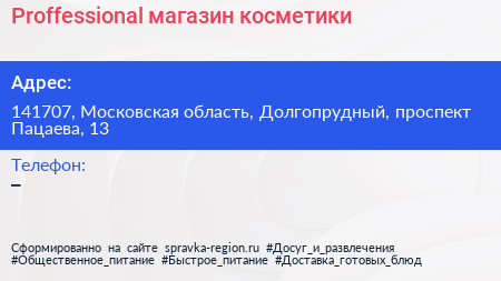 Proffessional, магазин косметики по адресу 141707, Московская область, Долгопрудный, проспект Пацаева, 13 в дальнейшем Организация, размещена в следующих категориях:
