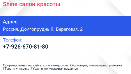 Shine, салон красоты по адресу 2, Парковая улица, Жилой комплекс «Бригантина», Водники, Химки, городской округ Долгопрудный, Московская область, Центральный федеральный округ, 141702, Россия в дальнейшем Организация, размещена в следующих категориях: