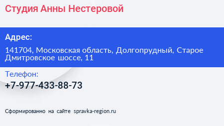 Студия Анны Нестеровой по адресу 141704, Московская область, Долгопрудный, Старое Дмитровское шоссе, 11 в дальнейшем Организация, размещена в следующих категориях: