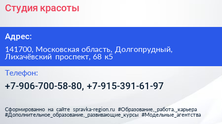 Студия красоты по адресу 141700, Московская область, Долгопрудный, Лихачёвский проспект, 68 к5 в дальнейшем Организация, размещена в следующих категориях: