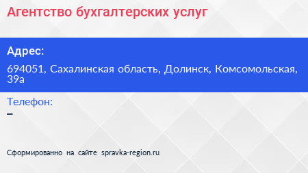 Агентство бухгалтерских услуг по адресу 694051, Сахалинская область, Долинск, Комсомольская, 39а в дальнейшем Организация, размещена в следующих категориях: