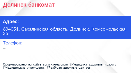 Долинск, банкомат по адресу 694051, Сахалинская область, Долинск, Комсомольская, 35 в дальнейшем Организация, размещена в следующих категориях: