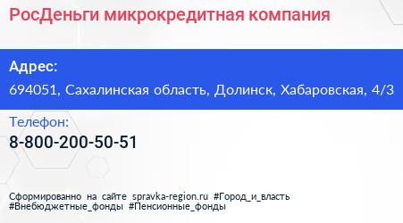 РосДеньги, микрокредитная компания по адресу 694051, Сахалинская область, Долинск, Хабаровская, 4/3 в дальнейшем Организация, размещена в следующих категориях: