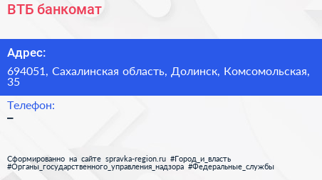 ВТБ, банкомат по адресу 694051, Сахалинская область, Долинск, Комсомольская, 35 в дальнейшем Организация, размещена в следующих категориях: