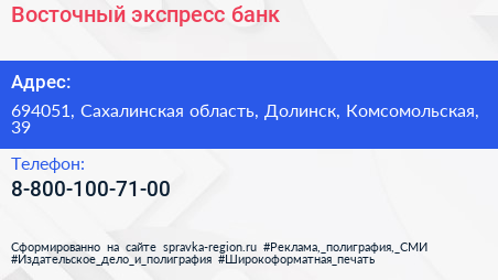 Восточный экспресс банк по адресу 694051, Сахалинская область, Долинск, Комсомольская, 39 в дальнейшем Организация, размещена в следующих категориях: