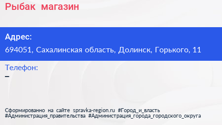 Рыбак+, магазин по адресу 694051, Сахалинская область, Долинск, Горького, 11 в дальнейшем Организация, размещена в следующих категориях: