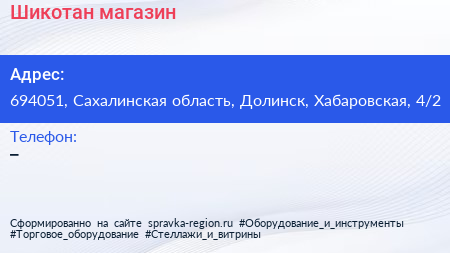 Шикотан, магазин по адресу 694051, Сахалинская область, Долинск, Хабаровская, 4/2 в дальнейшем Организация, размещена в следующих категориях: