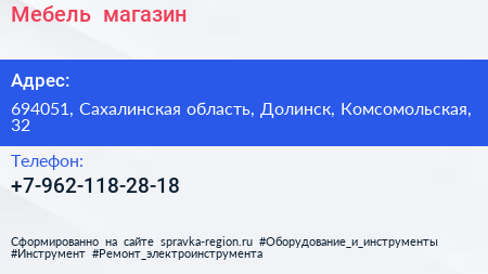 Мебель+, магазин по адресу 694051, Сахалинская область, Долинск, Комсомольская, 32 в дальнейшем Организация, размещена в следующих категориях: