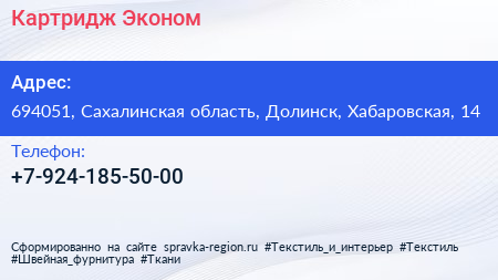 Картридж-Эконом по адресу 694051, Сахалинская область, Долинск, Хабаровская, 14 в дальнейшем Организация, размещена в следующих категориях: