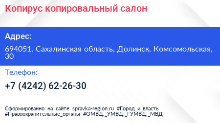 Копирус, копировальный салон по адресу 694051, Сахалинская область, Долинск, Комсомольская, 30 в дальнейшем Организация, размещена в следующих категориях: