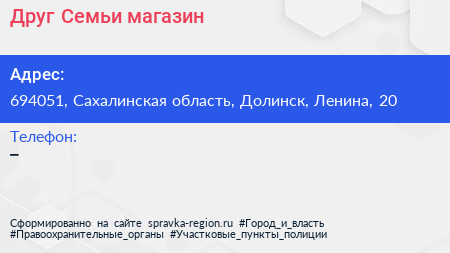 Друг Семьи, магазин по адресу 694051, Сахалинская область, Долинск, Ленина, 20 в дальнейшем Организация, размещена в следующих категориях: