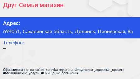 Друг Семьи, магазин по адресу 694051, Сахалинская область, Долинск, Пионерская, 8а в дальнейшем Организация, размещена в следующих категориях: