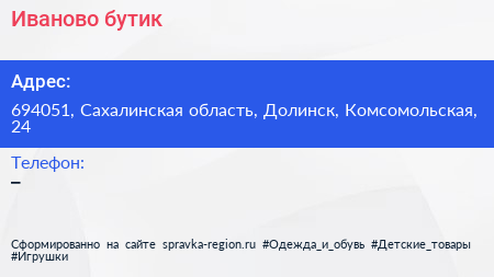 Иваново, бутик по адресу 694051, Сахалинская область, Долинск, Комсомольская, 24 в дальнейшем Организация, размещена в следующих категориях: