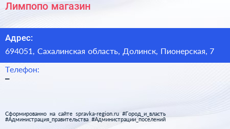 Лимпопо, магазин по адресу 694051, Сахалинская область, Долинск, Пионерская, 7 в дальнейшем Организация, размещена в следующих категориях: