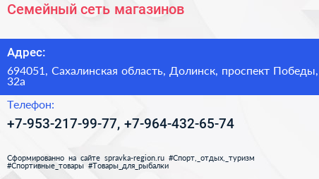 Семейный, сеть магазинов по адресу 694051, Сахалинская область, Долинск, проспект Победы, 32а в дальнейшем Организация, размещена в следующих категориях: