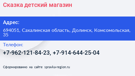 Сказка, детский магазин по адресу 694051, Сахалинская область, Долинск, Комсомольская, 35 в дальнейшем Организация, размещена в следующих категориях: