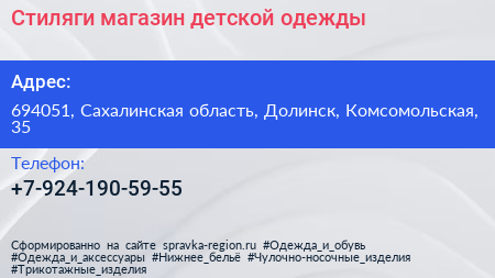 Стиляги, магазин детской одежды по адресу 694051, Сахалинская область, Долинск, Комсомольская, 35 в дальнейшем Организация, размещена в следующих категориях: