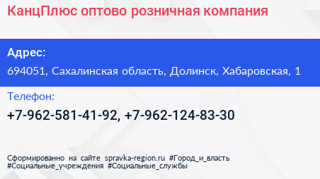 КанцПлюс, оптово-розничная компания по адресу 694051, Сахалинская область, Долинск, Хабаровская, 1 в дальнейшем Организация, размещена в следующих категориях: