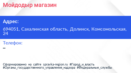 Мойдодыр, магазин по адресу 694051, Сахалинская область, Долинск, Комсомольская, 24 в дальнейшем Организация, размещена в следующих категориях: