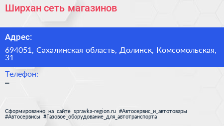 Ширхан, сеть магазинов по адресу 694051, Сахалинская область, Долинск, Комсомольская, 31 в дальнейшем Организация, размещена в следующих категориях: