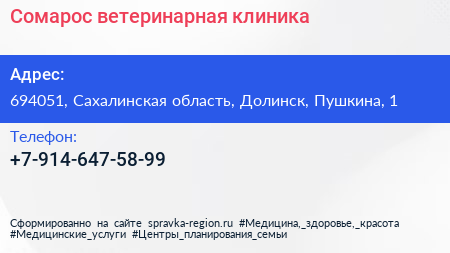 Сомарос, ветеринарная клиника по адресу 694051, Сахалинская область, Долинск, Пушкина, 1 в дальнейшем Организация, размещена в следующих категориях: