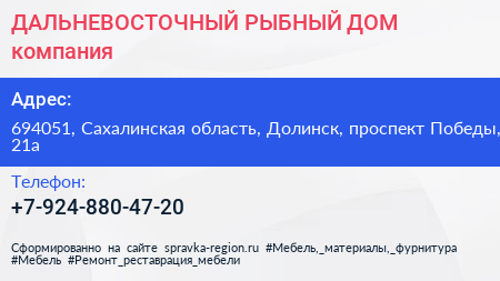 ДАЛЬНЕВОСТОЧНЫЙ РЫБНЫЙ ДОМ, компания по адресу 694051, Сахалинская область, Долинск, проспект Победы, 21а в дальнейшем Организация, размещена в следующих категориях: