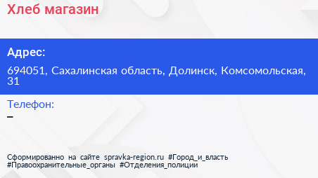 Хлеб, магазин по адресу 694051, Сахалинская область, Долинск, Комсомольская, 31 в дальнейшем Организация, размещена в следующих категориях: