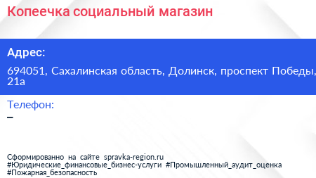 Копеечка, социальный магазин по адресу 694051, Сахалинская область, Долинск, проспект Победы, 21а в дальнейшем Организация, размещена в следующих категориях: