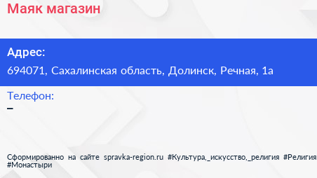 Маяк, магазин по адресу 694071, Сахалинская область, Долинск, Речная, 1а в дальнейшем Организация, размещена в следующих категориях: