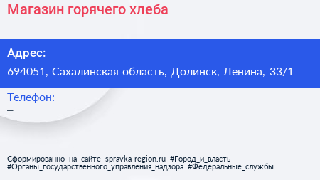 Магазин горячего хлеба по адресу 694051, Сахалинская область, Долинск, Ленина, 33/1 в дальнейшем Организация, размещена в следующих категориях: