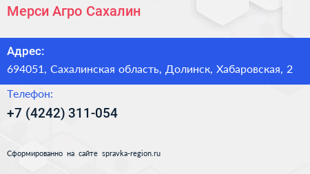 Мерси Агро Сахалин по адресу 694051, Сахалинская область, Долинск, Хабаровская, 2 в дальнейшем Организация, размещена в следующих категориях: